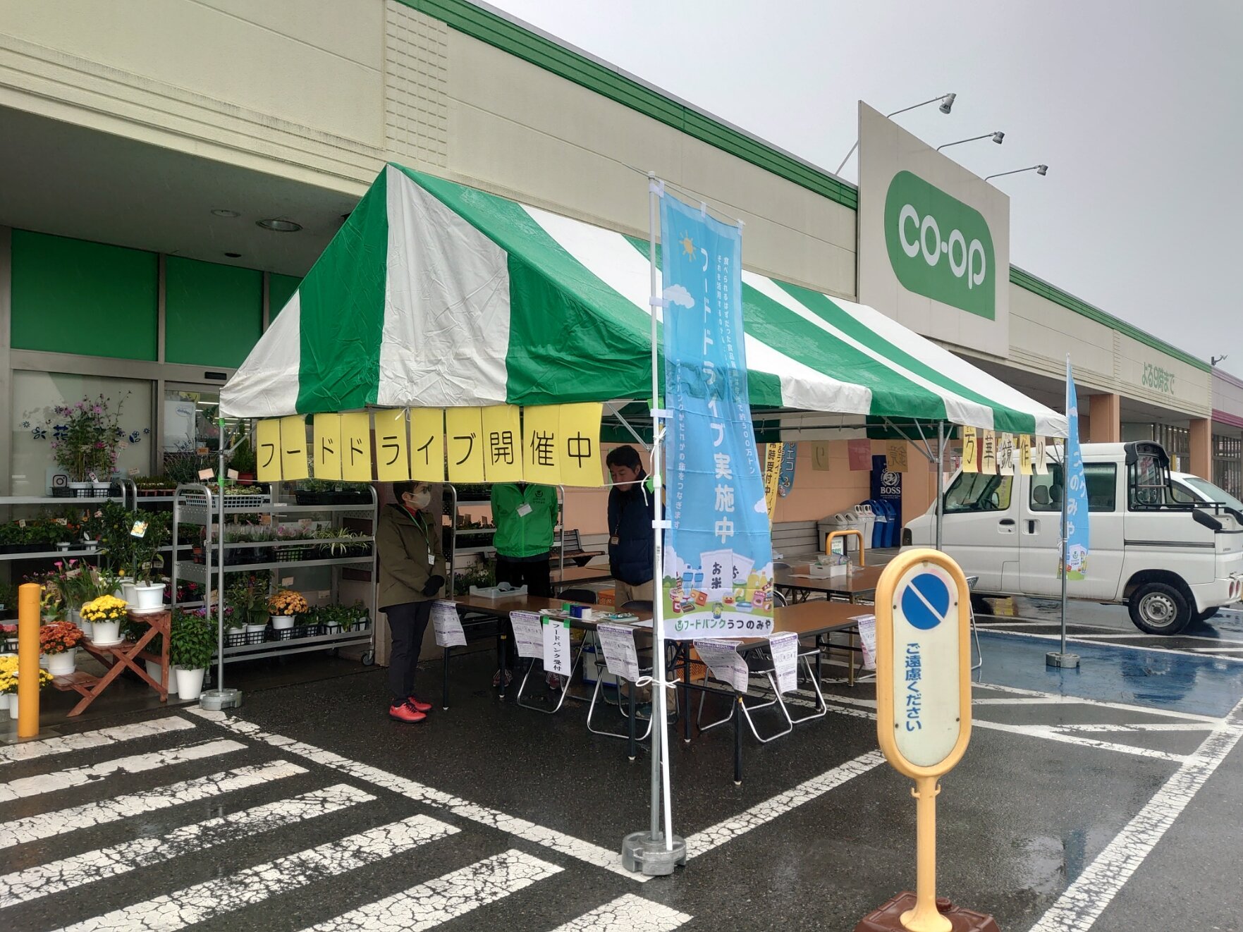 10月26日(日)コープ越戸店の駐車場にテントを設置し「店頭フード&ライフドライブ」を開催しました。小雨の降るあいにくの空模様でしたが、18件の参加があり、食料品20.8㎏と日用品22.3㎏が寄せられました。宇都宮ブロックから理事とブロック委員が参加し「万華鏡作り」の講習をしました。参加された組合員の皆様、足を止めて関心をお寄せいただいた方、ありがとうございました。