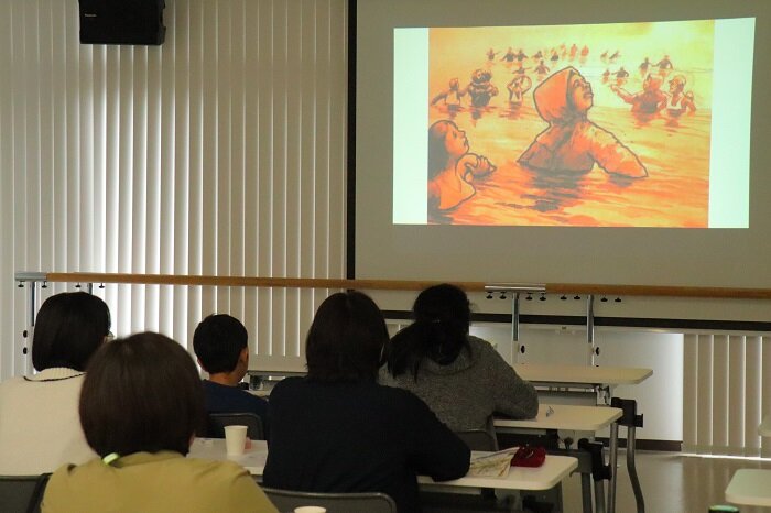 後半は、「火の海になったうつのみや」と題し、語り部さんの朗読による紙芝居風にスライド上映です。