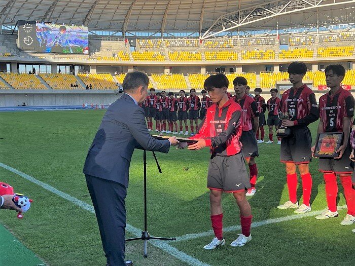 11月15日(土)、第104回全国高校サッカー選手権 栃木県大会決勝戦がカンセキスタジアムで行なわれました。その表彰式にて、協賛社・パートナー社を代表して、とちぎコープの紺野有史常務理事から優勝校の矢板中央高等学校の選手たちへ協賛社盾を授与しました。