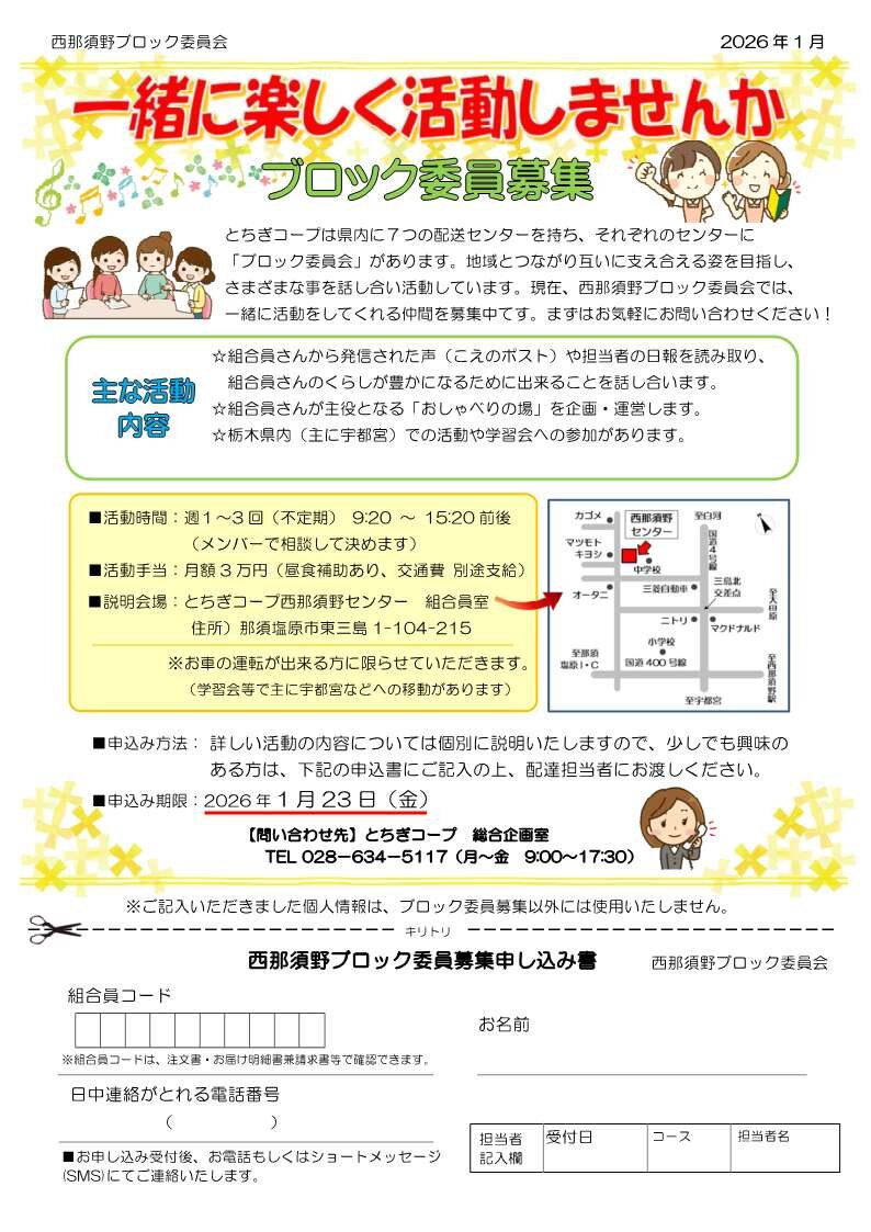 とちぎコープは県内に7つの配送センターを持ち、それぞれのセンターに「ブロック委員会」があります。地域とつながり互いに支え合える姿を目指し、さまざまな事を話し合い活動しています。現在、西那須野ブロック委員会では、一緒に活動をしてくれる仲間を募集中です。まずはお気軽にお問い合わせください!